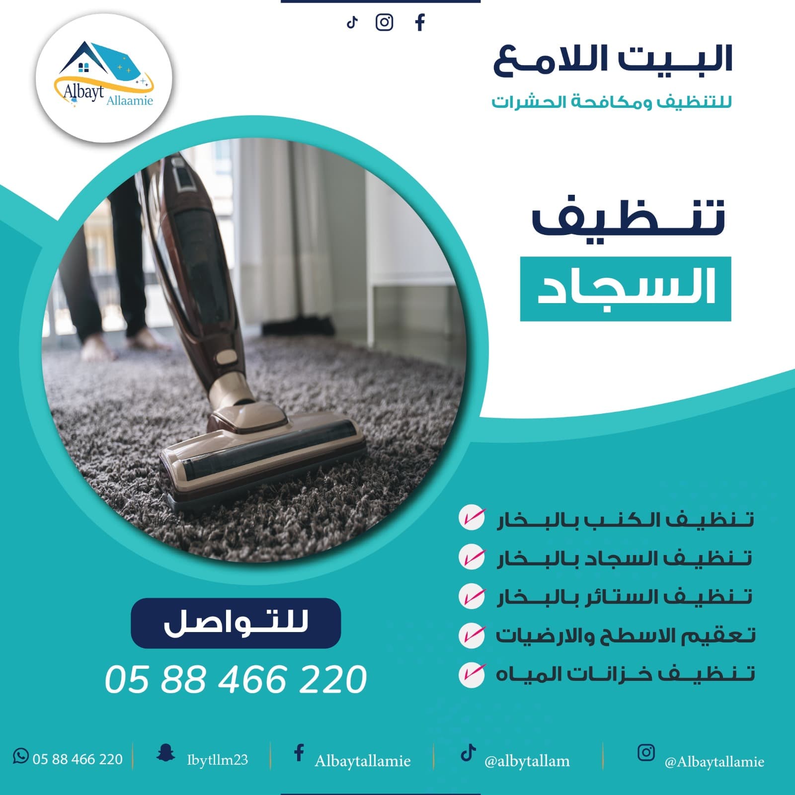 تعتقد بعض ربات المنزل بأن عملية تنظيف السجاد مرهقة ويمكن التجاوز عنها، ولكن مع شركة البيت اللامع للتنظيف أصبح الأمر أكثر سهولة ويتم دون الحاجة إلى بذل مجهود، يمكن حينها التمتع بفوائد تنظيف السجاد والتي تتمثل في المحافظة على جودة السجاد ومظهره الجميل الذي يسهل استقبال الضيوف في أي وقت.